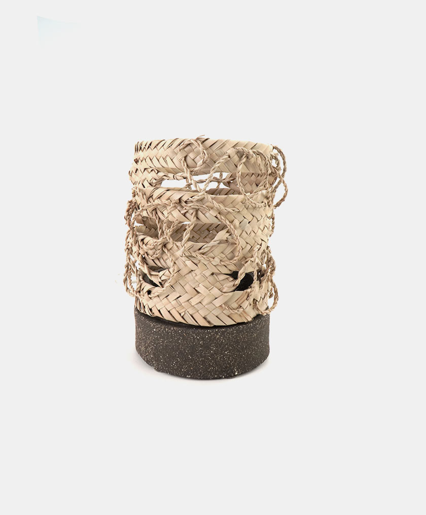 Làmpada de cercles tancats de llatra natural mesclada amb brins verds naturals sense assecar. La corda de l’endoll està folrada de llatra. Per regular la llargària de la làmpada, es pot fer un nus adaptatiu. És d’invenció pròpia.El color verd d’aquesta làmpada no és tenyit, sinó que és el color natural dels brins. A més, amb el temps el color anirà modulant, perquè els brins es van assecant. Tot i això, sempre romandrà una diferència de tons entre el color cru natural de la llatra i el verd dels brins.